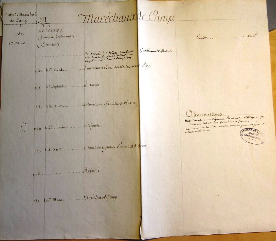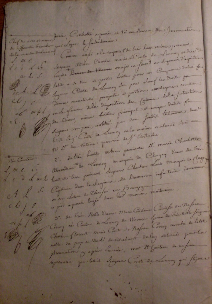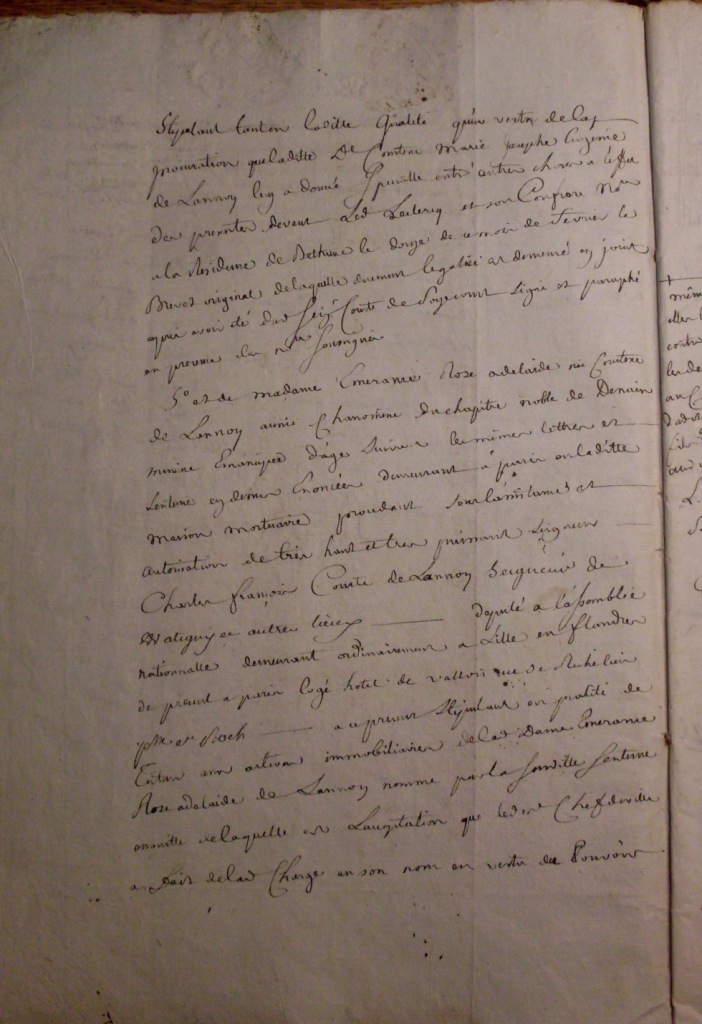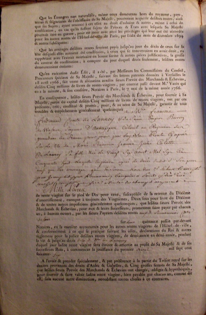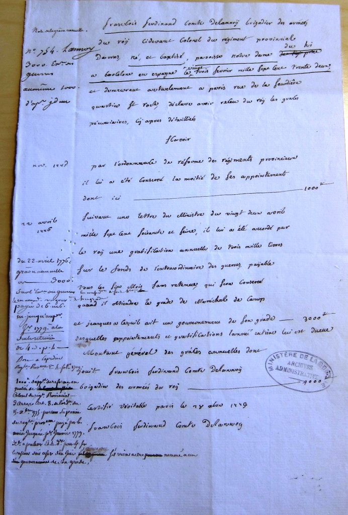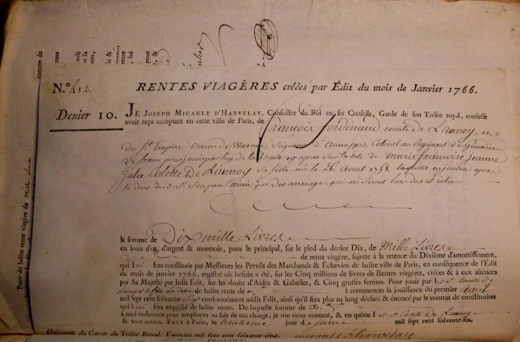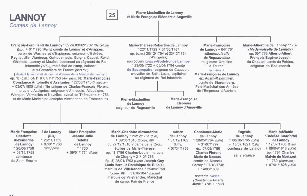 le testament du comte de Lannoy(voir document 8a), un inventaire aprĂšs son dĂ©cĂšs(voir documents 8b), l’acte de vente d’un bien familial(voir document 8c), un Ă©tat des services aux armĂ©es du Roi (voir document 8d), une lettre de juillet 1768 du Ministre de la Guerre(voir document 8e), un acte Ă©tablissant une rente viagĂšre accordĂ©e au comte par le Roi de France,(voir document 8f) une convention de juillet 1771 (voir document 8g), une gĂ©nĂ©alogie de la famille de Lannoy avec les enfants du couple Lannoy â d’Assignies(voir document 8h), une transaction du 16 octobre 1783(voir document 8i), deux actes rattachant le comte Ă la commune de Verquin.(voir documents 8j )