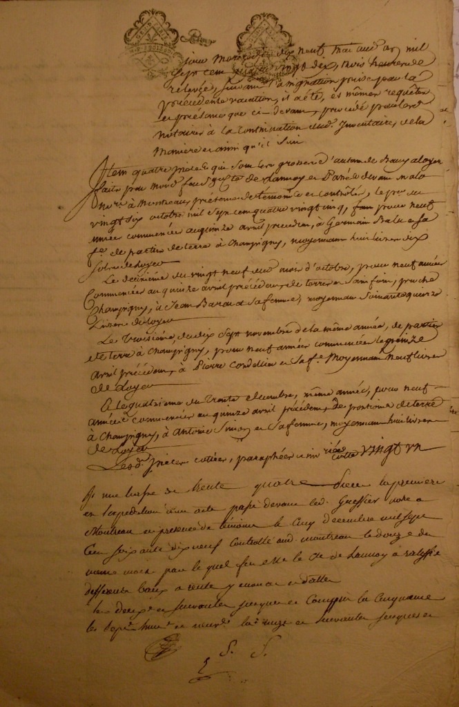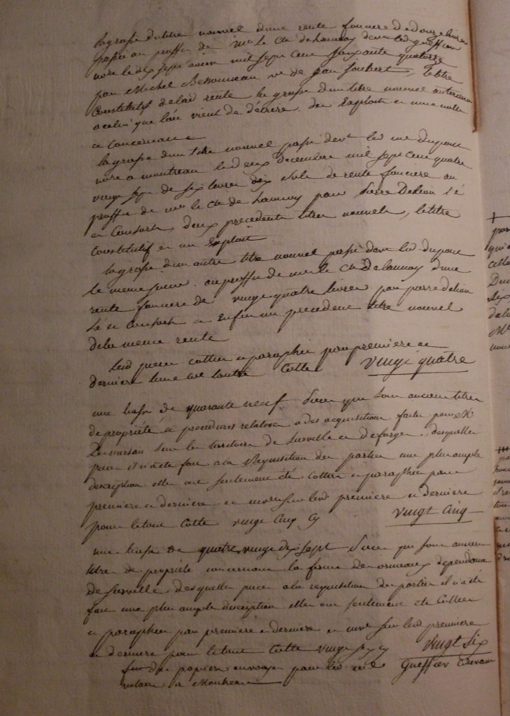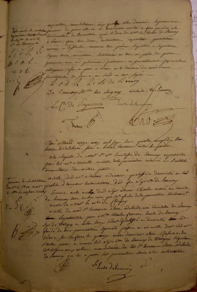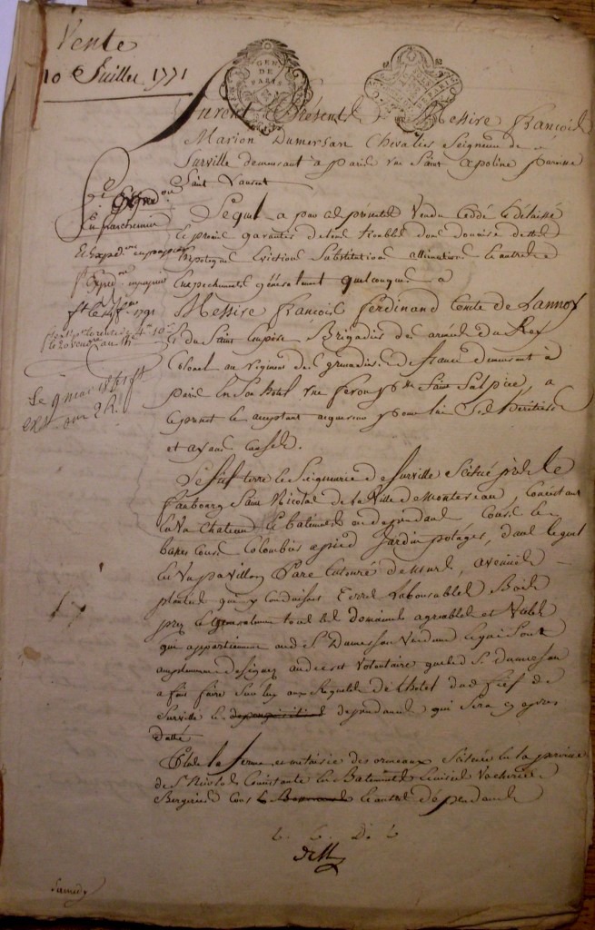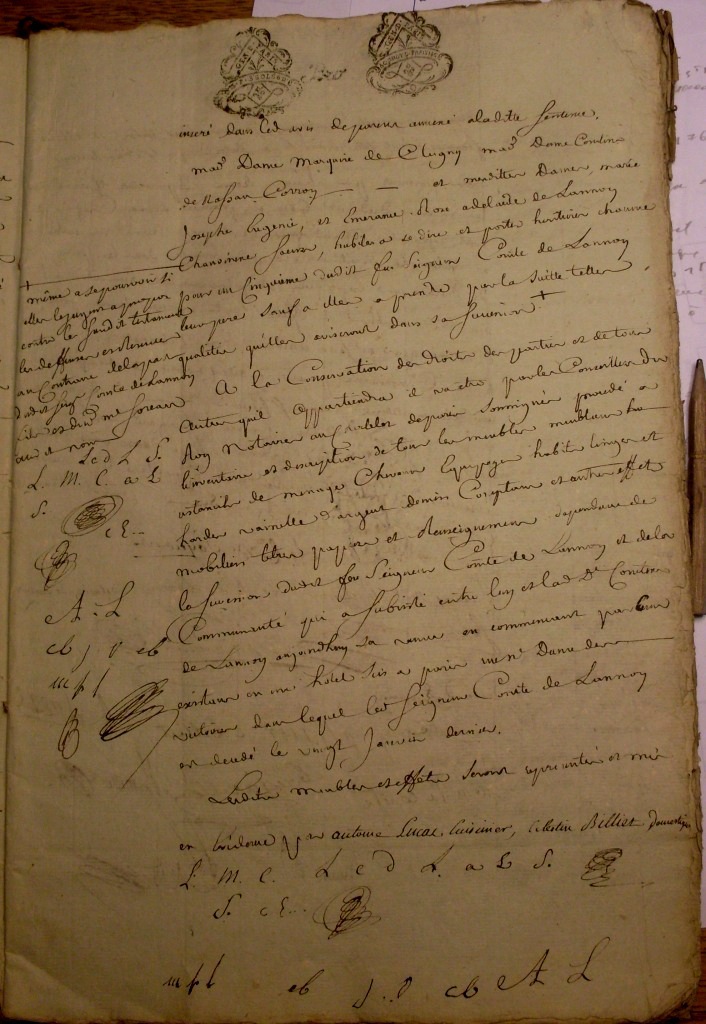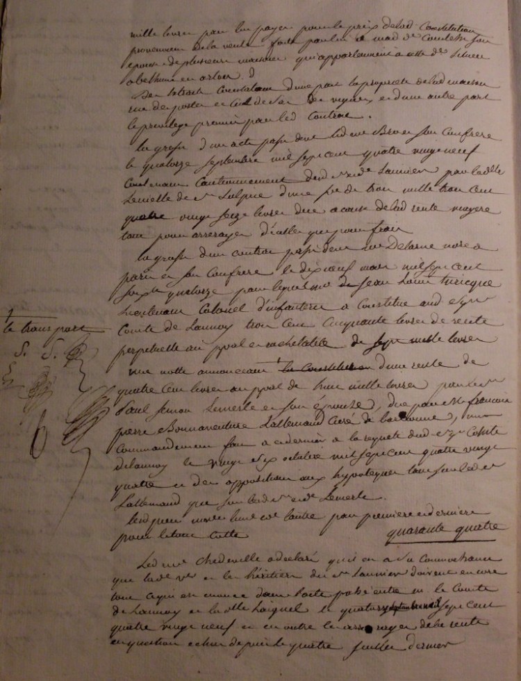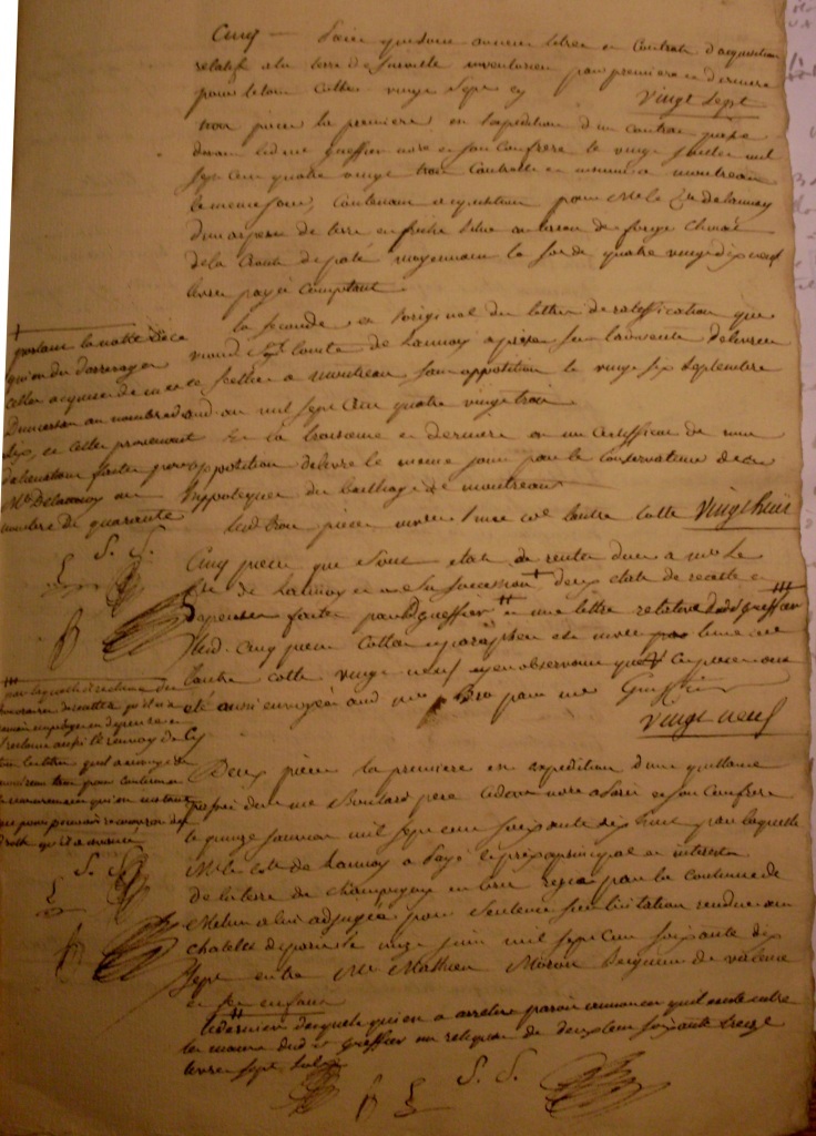 le testament du comte de Lannoy(voir document 8a), un inventaire aprĂšs son dĂ©cĂšs(voir documents 8b), l’acte de vente d’un bien familial(voir document 8c), un Ă©tat des services aux armĂ©es du Roi (voir document 8d), une lettre de juillet 1768 du Ministre de la Guerre(voir document 8e), un acte Ă©tablissant une rente viagĂšre accordĂ©e au comte par le Roi de France,(voir document 8f) une convention de juillet 1771 (voir document 8g), une gĂ©nĂ©alogie de la famille de Lannoy avec les enfants du couple Lannoy â d’Assignies(voir document 8h), une transaction du 16 octobre 1783(voir document 8i), deux actes rattachant le comte Ă la commune de Verquin.(voir documents 8j )