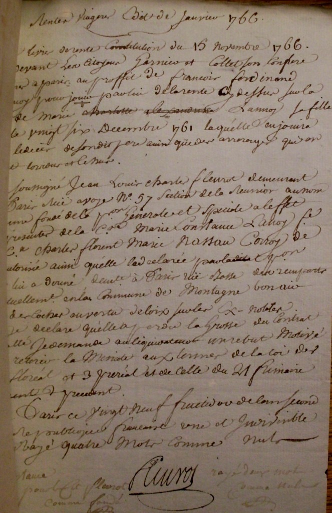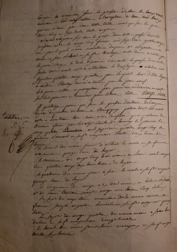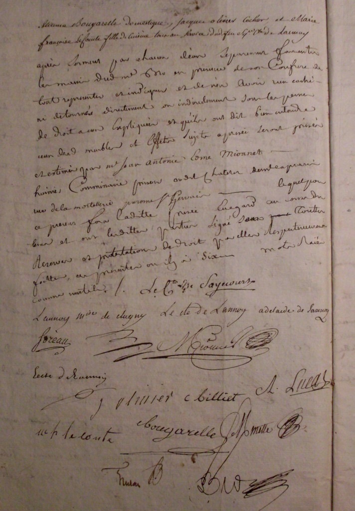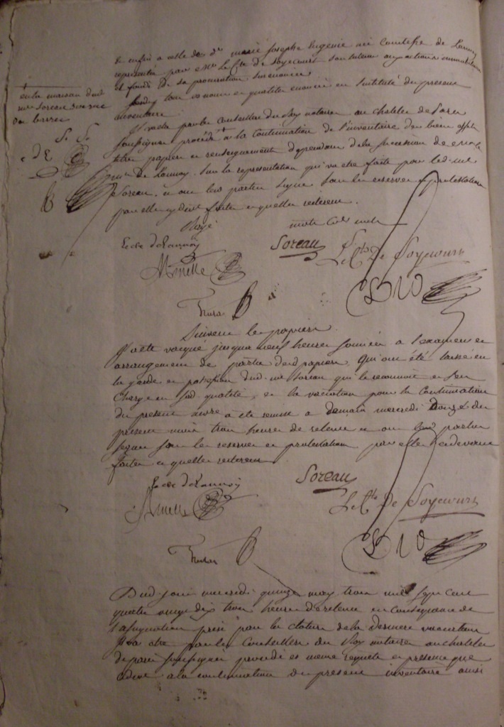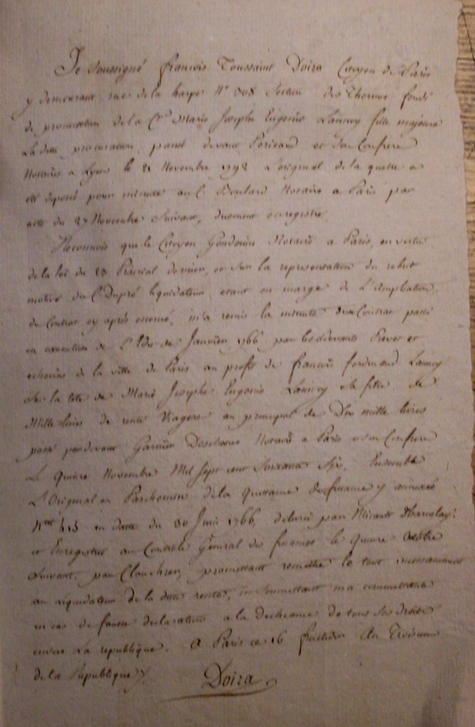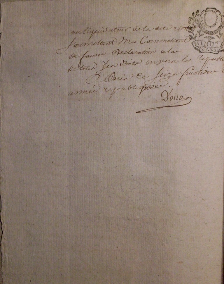 « La citoyenne marie françoise constance antoinette dassignies, veuve de françois ferdinant lannoy, dĂ©clare avoir cinquante quatre ans, elle ne peut dire son revenue ayant des charges a payĂ© de sur son biens, ayant le sellĂ©e de sur ses papiers, je dĂ©clare ĂȘtre cultivatrice est jen ai fait la dĂ©claration aux dont forcĂ©e est aux administrateurs du directoire du district de la commune de bĂ©thune je dĂ©clare avoir Ă©tĂ© arrĂȘtĂ©e le vingt huit pluvios par mesures de suretĂ© gĂ©nĂ©ral des reprĂ©sentants st just est le bas Ă bĂ©thune le dix dĂ©cadi de messidor lan deuxiĂšme de la rĂ©publique française une et indivisible, la citoyenne Vá” lannoĂż ».