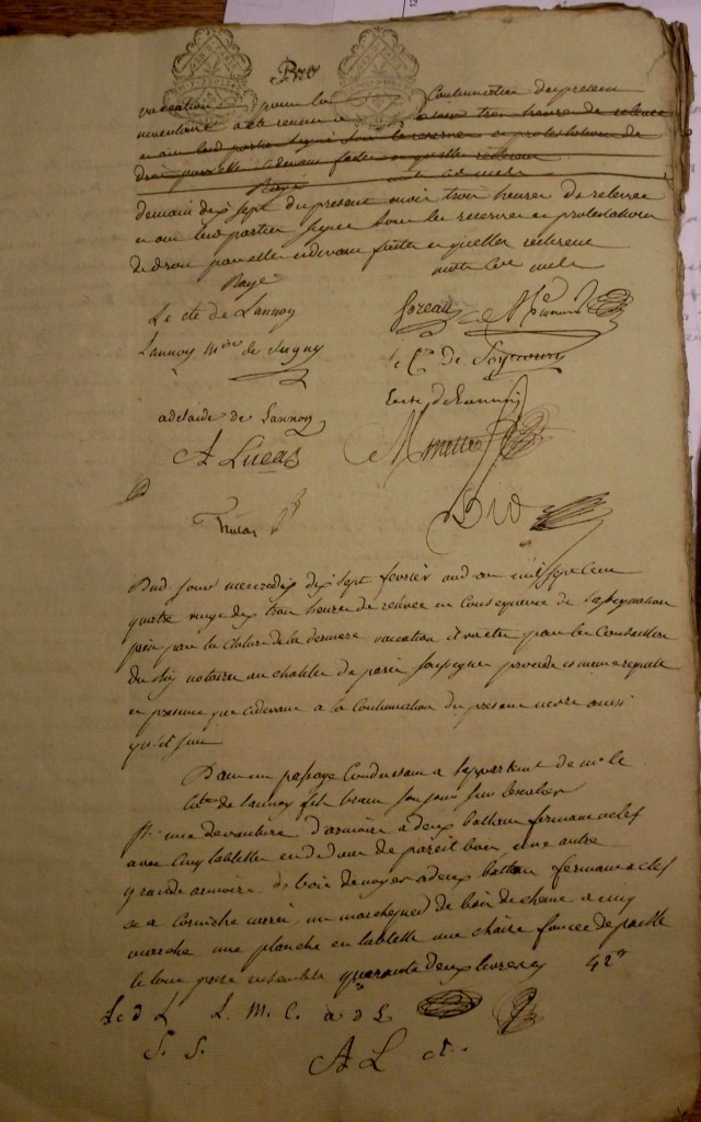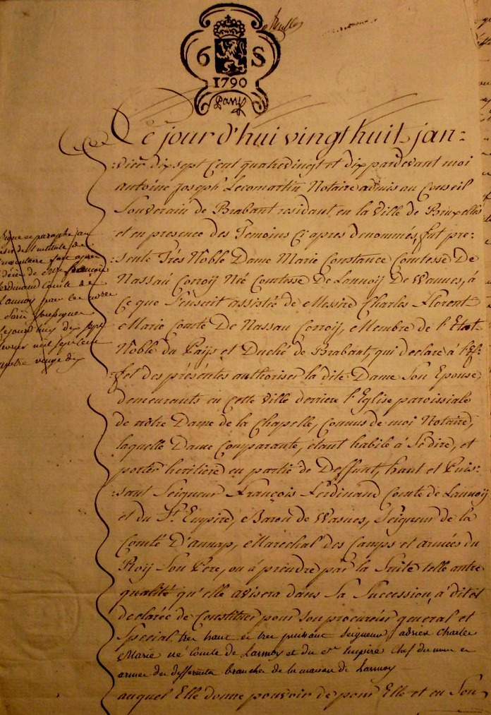Son mari, François-Ferdinand de Lannoy, meurt peu aprĂšs au sein de la paroisse Saint-Eustache Ă Paris, le 20 janvier 1790 (voir document 4). Il a laissĂ© un certain nombre d’actes retraçant son parcours civil et militaire, ainsi que celui de sa famille (voir documents 8). Parmi ces prĂ©cieux documents se trouvent :