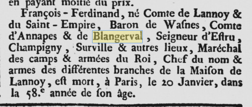 «…nous allĂąmes voir la maison du comte de Blangerval Ă Ennequin, qui est la plus grosse et la plus belle maison du pays d’Artois. Elle est Ă deux lieues de BĂ©thune. L’on y voit une grosse quantitĂ© de tableaux trĂšs rares que l’on estime infiniment. La plupart sont des tableaux et des portraits d’ancĂȘtres rĂ©alisĂ©s par Van Dick. ll y a un Leda, autre peintre qui est estimĂ© ĂȘtre un chef d’oeuvre de peinture. Les appartements et les jardins sont trĂšs beaux.Cette maison mĂ©rite bien que l’on se donne la peine d’y aller et l’on est trĂšs agrĂ©ablement reçu par le comte de Blangerval »