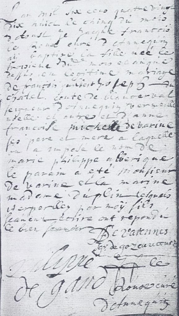 Née le dimanche 3 août 1698, Marie-Philippe-Albérique est la fille de François Guilbert Joseph du CHASTEL, Comte de Blangerval et seigneur d’Annequin, Vermelles, Noyelles et autres lieux, et de Anne Françoise Michèle de VARENNE (Document 1). Par son sang, elle porte l’héritage de domaines clés de notre contrée d’Artois.