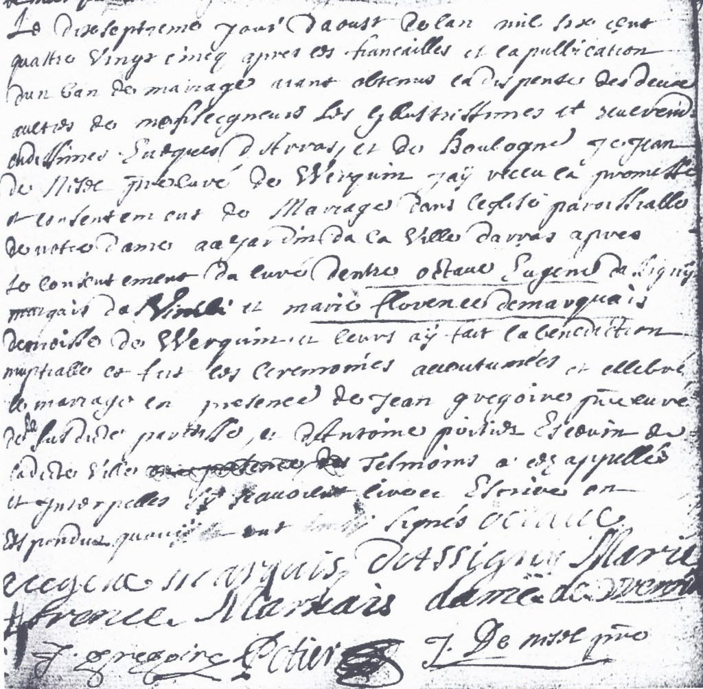 François-Eugène, né en 1688, est issu d’une lignée solidement implantée. Son père, Octave Eugène, marquis d’ASSIGNIES et avoué de Thérouanne, avait épousé Marie Florence de MARQUAIS, dame de Verquin, union célébrée à la Chapelette d’Arras le 17 août 1685 (Document 2),aux termes d’un contrat signé le 9 août pardevant Maîtres De Warlincourt et Billion.