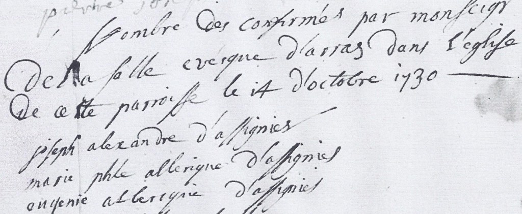 Les registres paroissiaux d’Annequin conservent l’acte de confirmation par Monseigneur DE LA SALLE, évêque d’Arras, de trois des enfants du couple à la date du 14 octobre 1730 (document n°3).