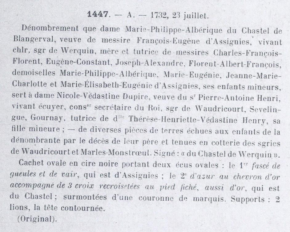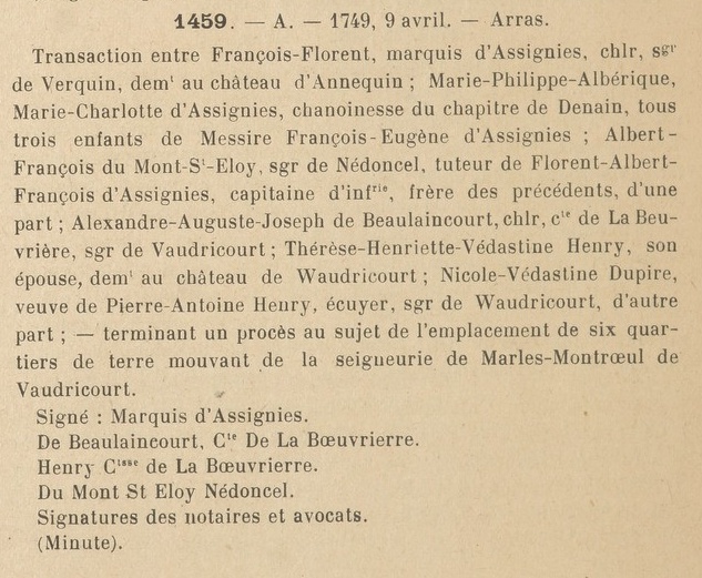 On retrouve également les enfants du couple dans une transaction du 9 avril 1749 mettant un terme à un procès portant sur l’emplacement de six quartiers de terre relevant de la seigneurie de Vaudricourt (document n°4). Ces mêmes parcelles furent déjà l’objet d’un dénombrement en date du 23 juillet 1732 suite au décès de François- Eugène d’ASSIGNIES (document n°5).