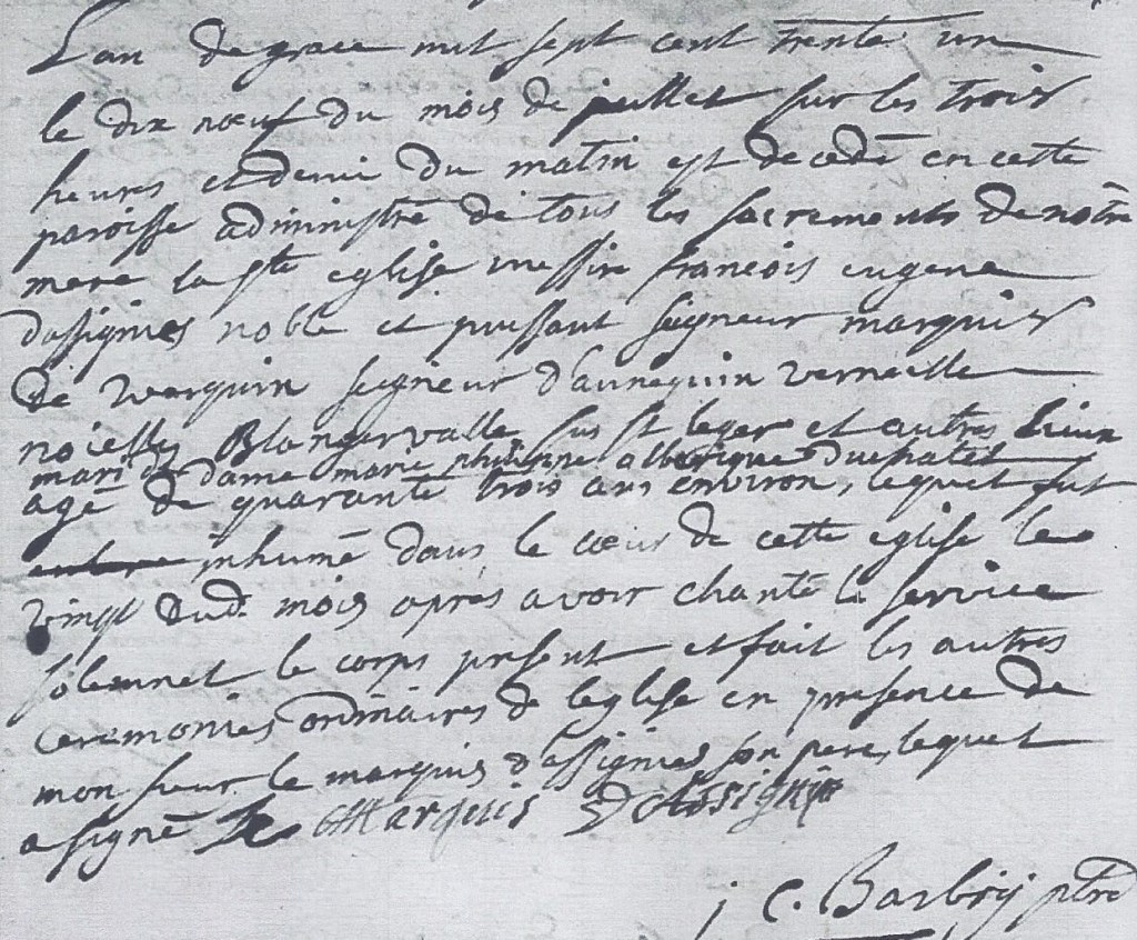 ┼ François- Eugène d’ASSIGNIES meurt à Annequin à l’âge de 43 ans vers trois heures et demie du matin le jeudi 19 juillet 1731 (document n°6).
