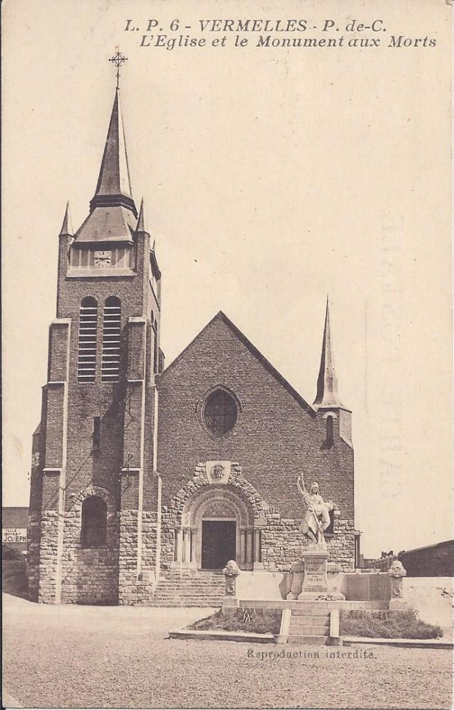 Photographie de l’église de Vermelles alors surmontée de sa croix (remplacée depuis par un coq) et le monument aux morts, au milieu de notre place, avant qu’il ne soit déplacé en décembre 1934.