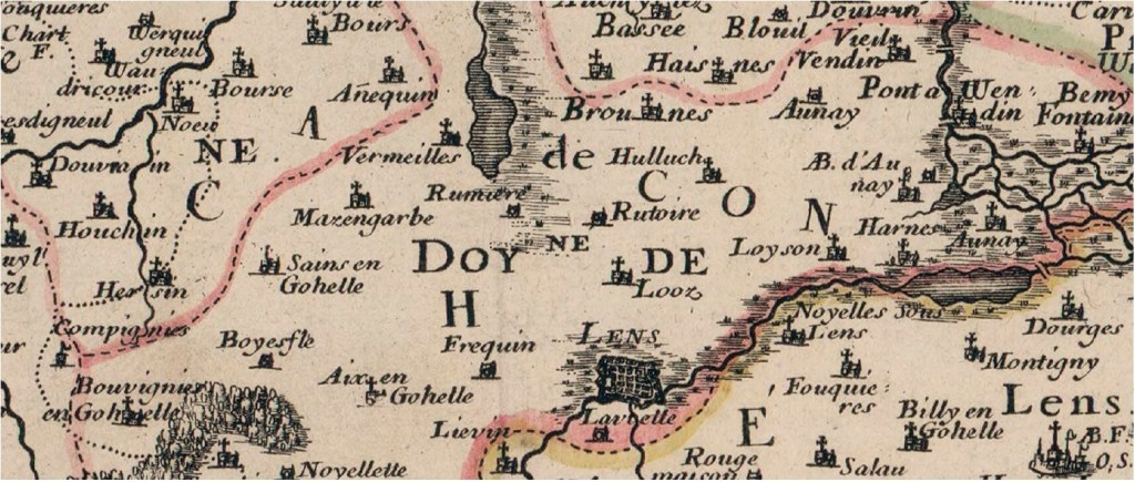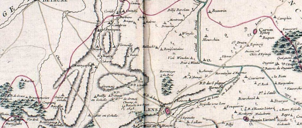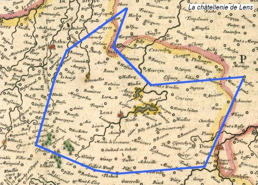 Carte de l’ancien baillage de LENS auquel jadis VERMELLES (alors « Vermeille ») appartenait judiciairement et administrativement.